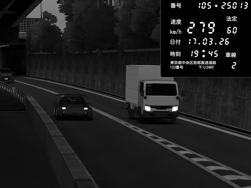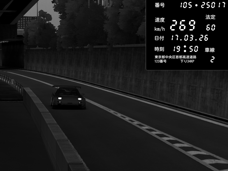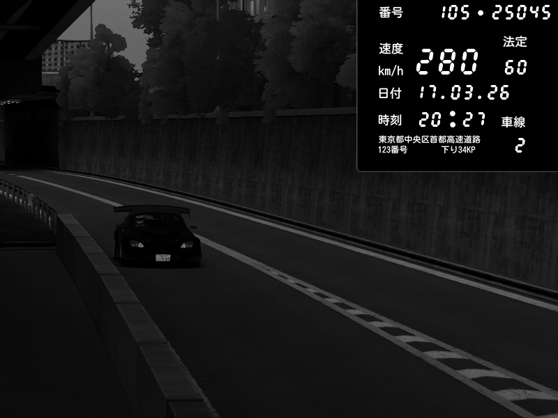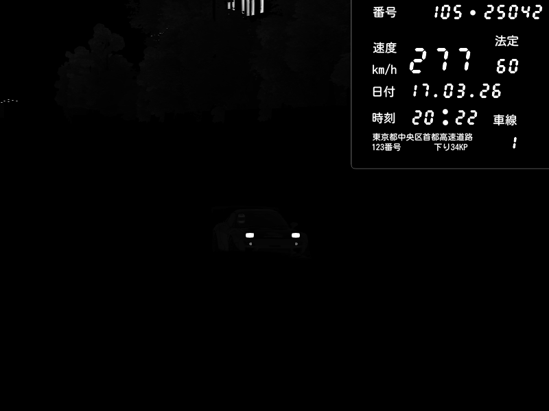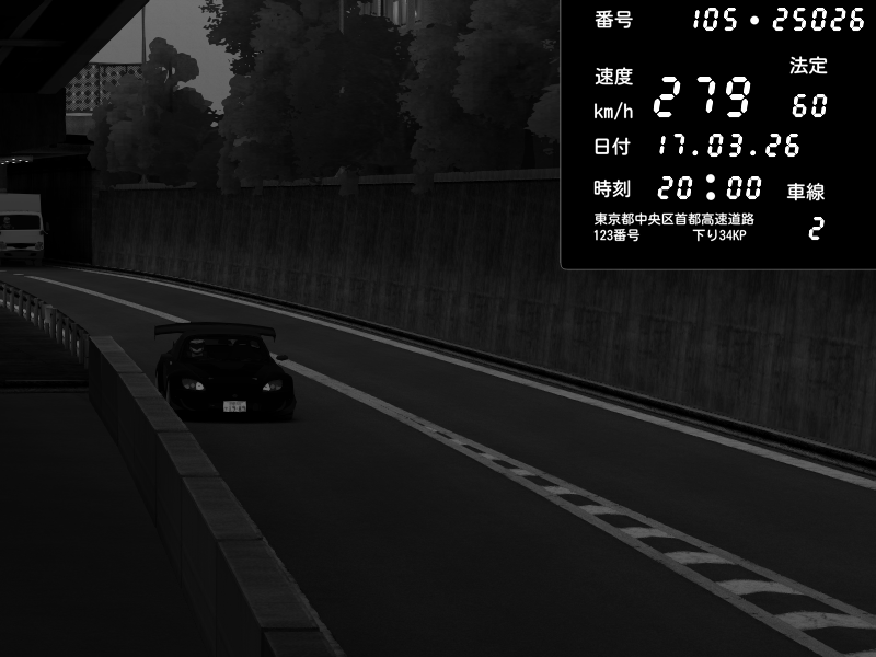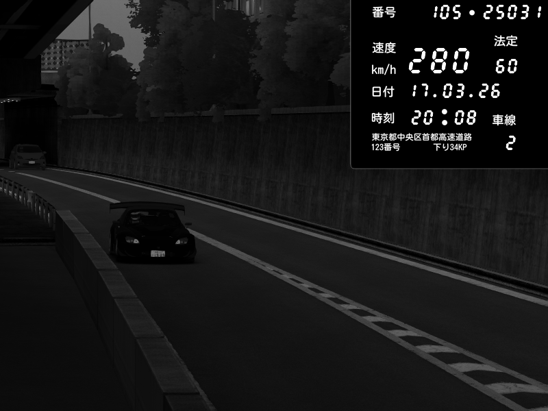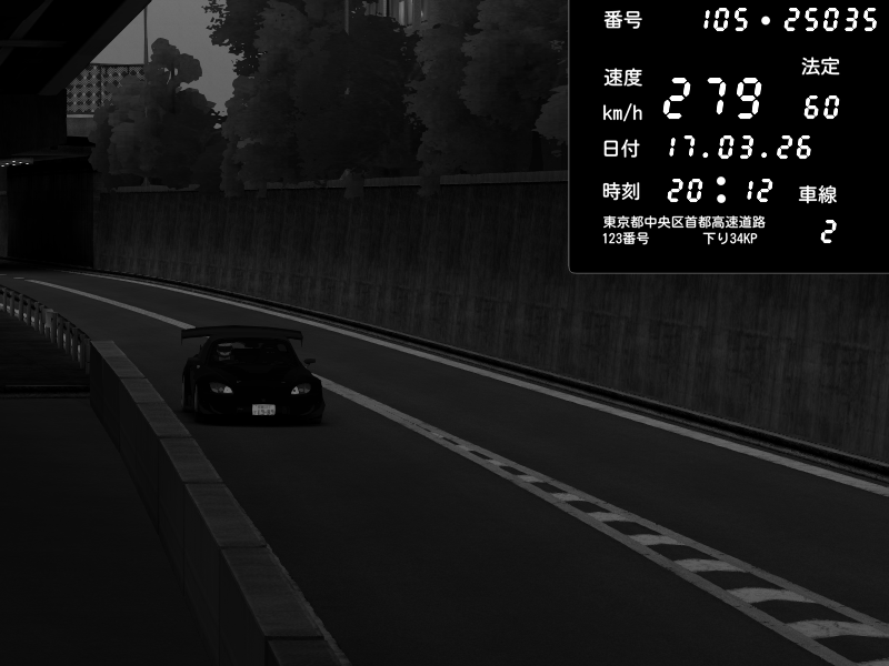| 2026/03/17 20:27 | C1外回り 京橋 | 280 / 60 km/h | U-0 | Honda S2000 Turbo GT1 Amuse (AP1) | CAPTURE |