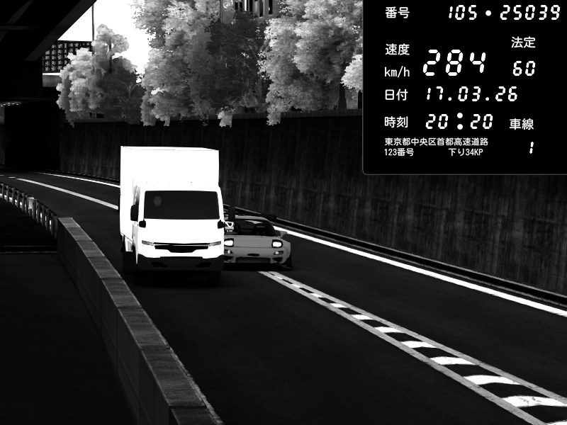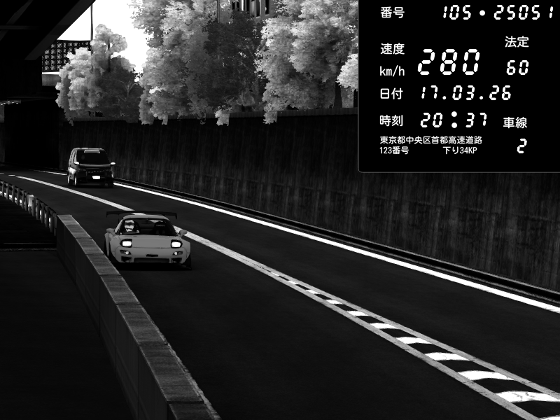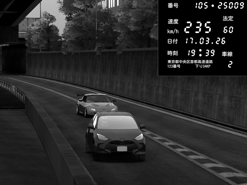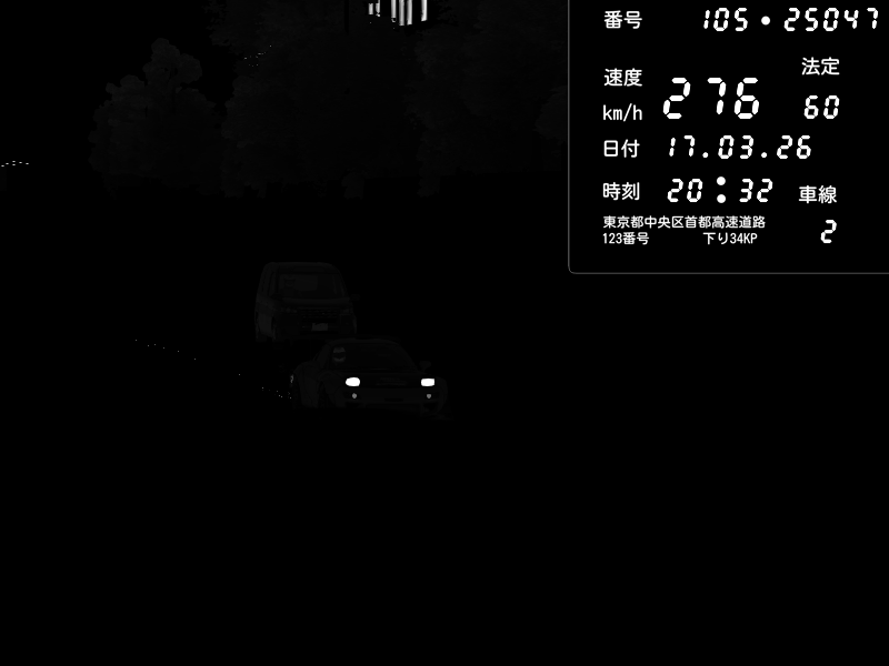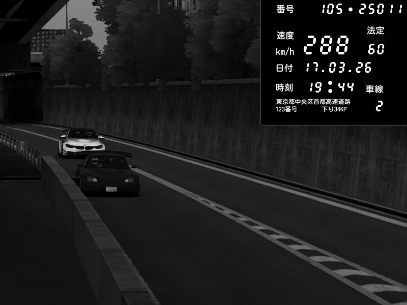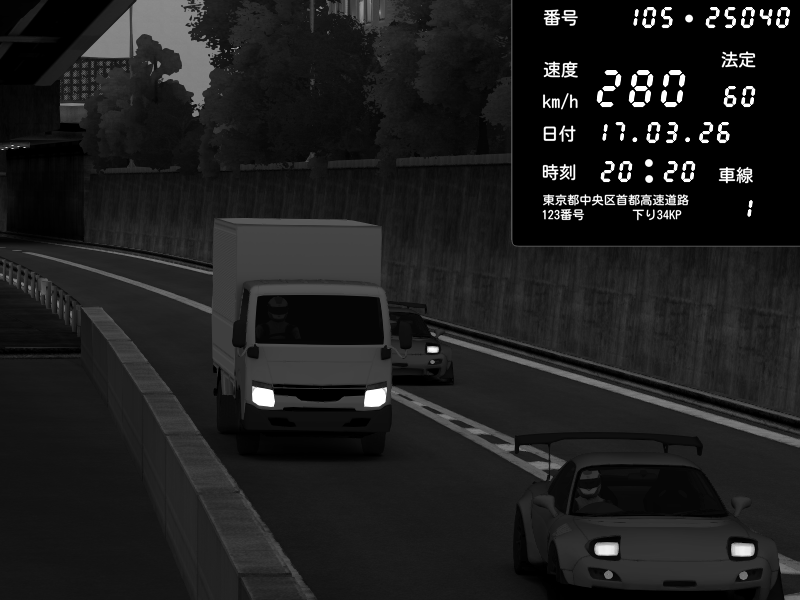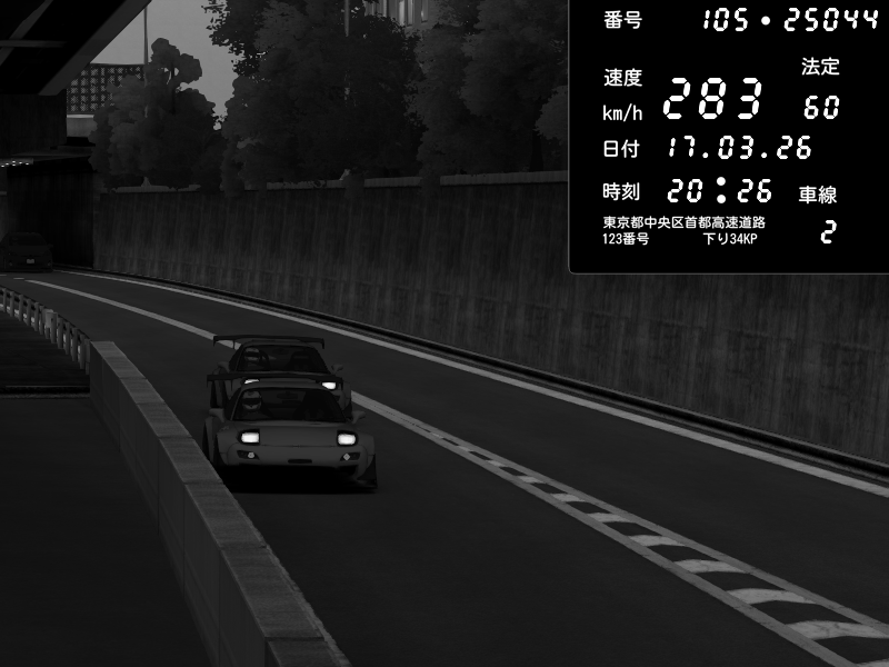 | 2026/03/17 20:27 | C1外回り 京橋 | 280 / 60 km/h | U-0 | Honda S2000 Turbo GT1 Amuse (AP1) | CAPTURE |