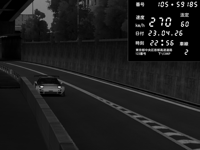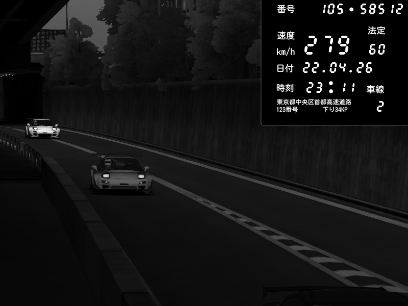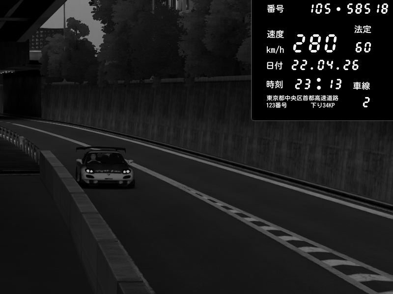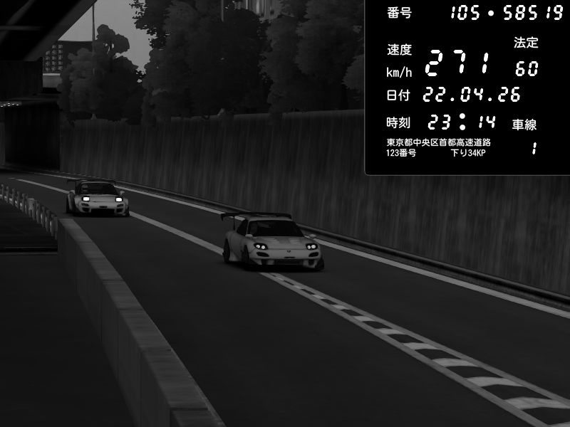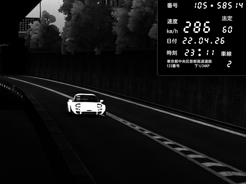 | 2026/04/22 01:22 | C1外回り 京橋 | 255 / 60 km/h | ponpoco | Mazda RX-7 FD3S FEED Afflux GT3 | CAPTURE |