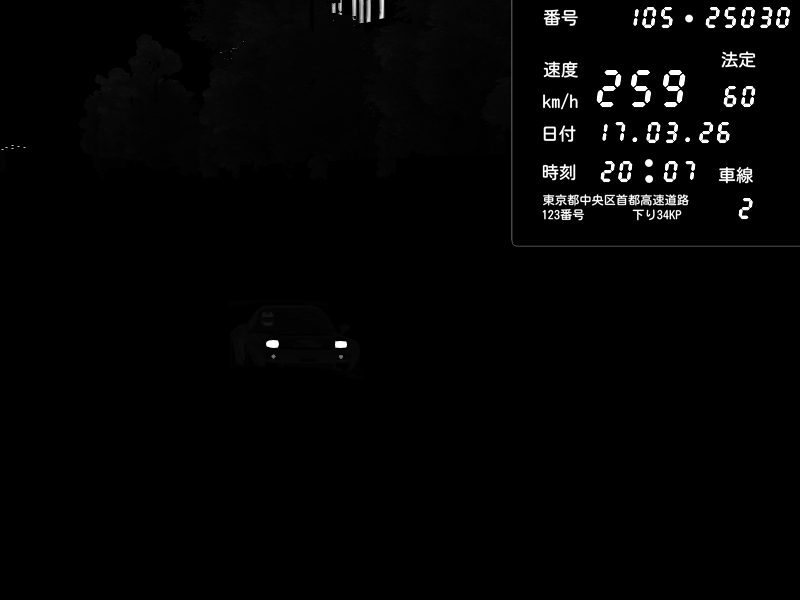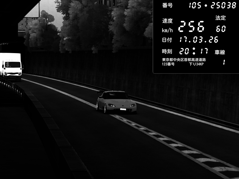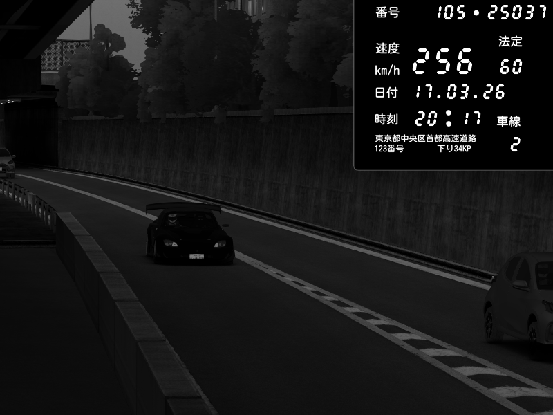| 2026/03/17 20:17 | C1外回り 京橋 | 256 / 60 km/h | U-0 | Honda S2000 Turbo GT1 Amuse (AP1) | CAPTURE |