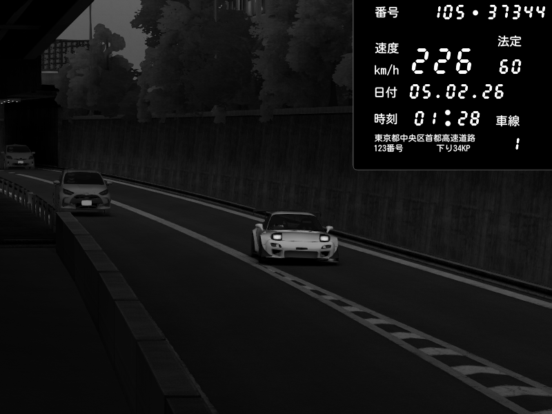 | 2026/02/05 01:43 | C1外回り 京橋 | 226 / 60 km/h | my1l | Mazda RX-7 FD3S FEED Afflux GT3 | CAPTURE |