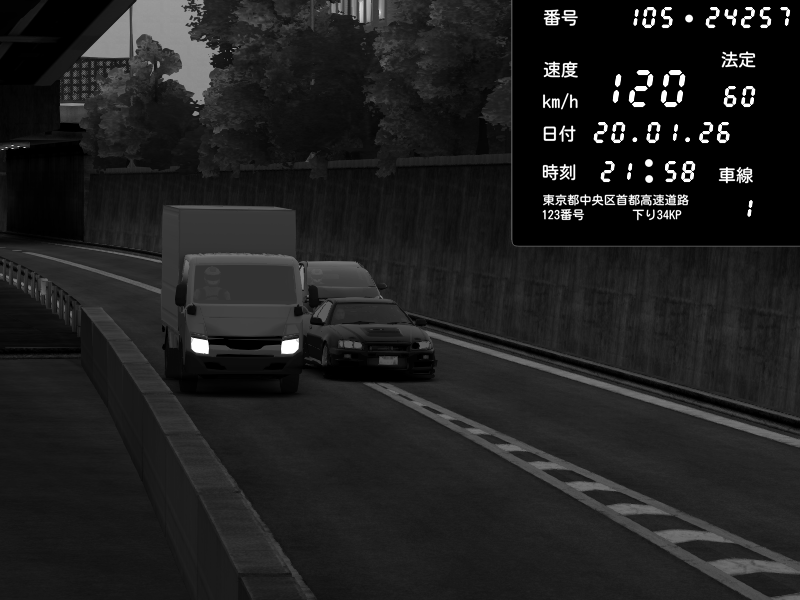 | 2026/01/20 21:32 | C1外回り 京橋 | 195 / 60 km/h | Player | Nissan GT-R NISMO 2017 | CAPTURE |