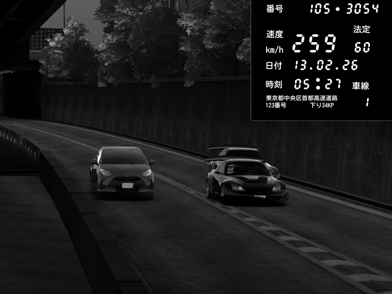 | 2026/02/14 02:52 | C1外回り 京橋 | 255 / 60 km/h | YF13 | Honda S2000 (AP2 - Legendary) | CAPTURE |