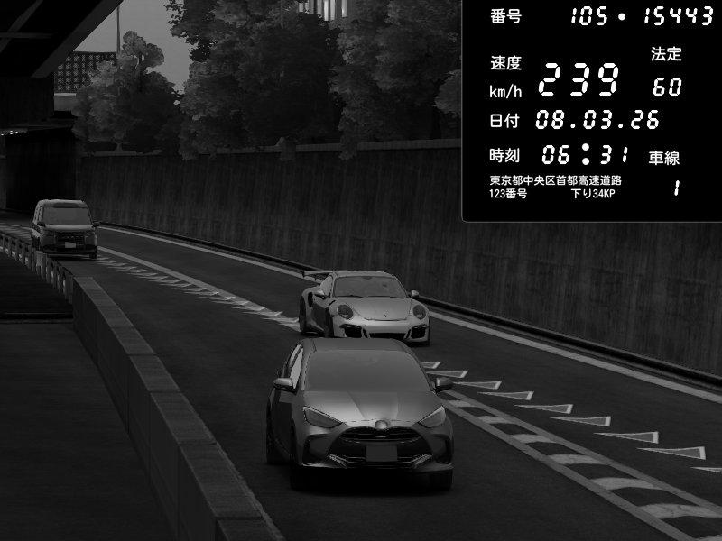 | 2026/03/08 06:31 | C1外回り 京橋 | 239 / 60 km/h | Chiyo | Porsche 911 GT3 RS | CAPTURE |