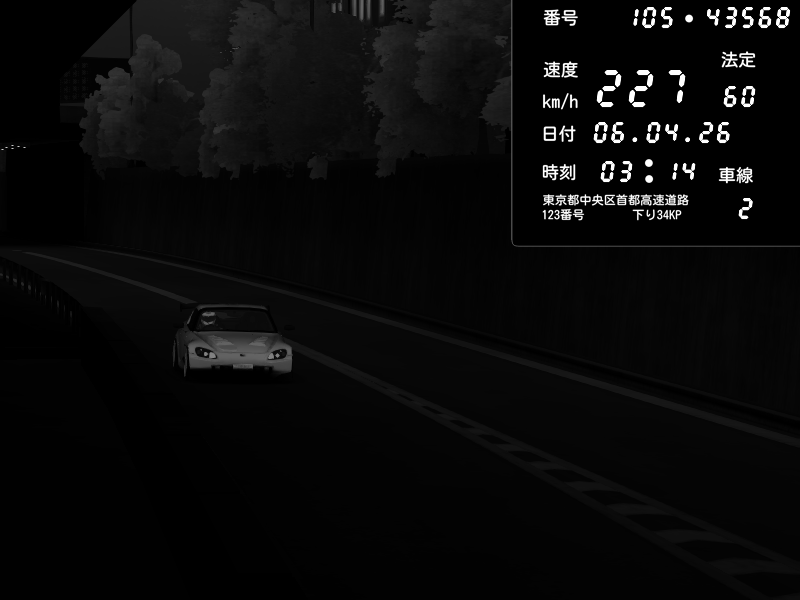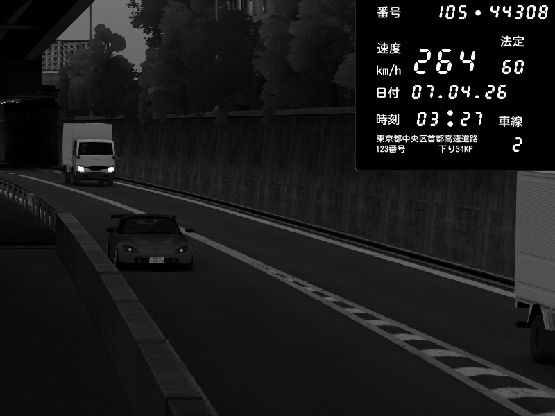 | 2026/04/07 03:27 | C1外回り 京橋 | 264 / 60 km/h | Sh0a | Honda S2000 (AP2 - Legendary) | CAPTURE |