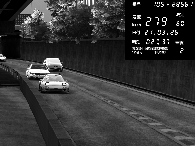 | 2026/03/21 02:37 | C1外回り 京橋 | 279 / 60 km/h | Futas | Mazda RX-7 FD3S FEED Afflux GT3 | CAPTURE |