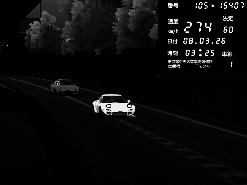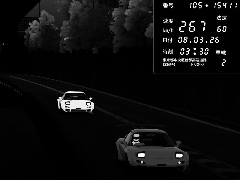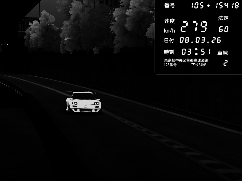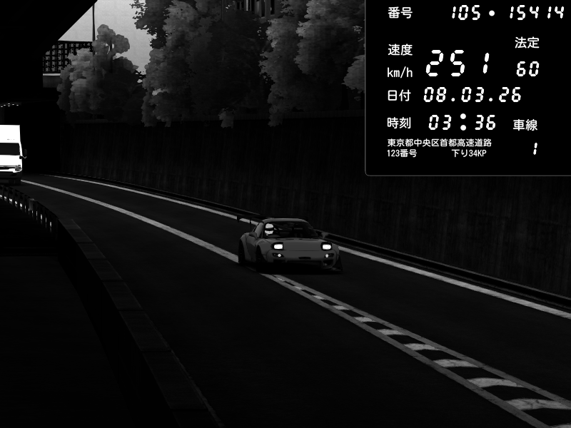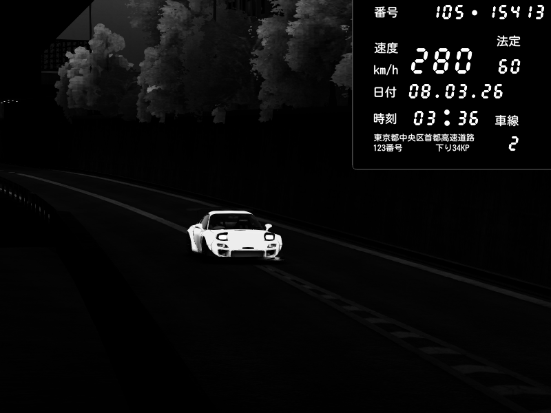 | 2026/03/08 03:54 | C1外回り 京橋 | 260 / 60 km/h | Player | Mazda RX-7 FD3S FEED Afflux GT3 | CAPTURE |