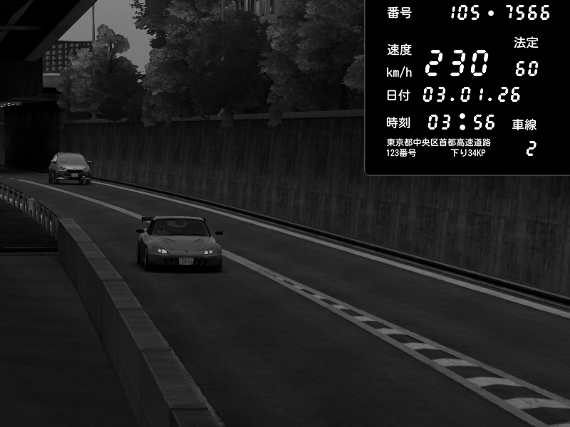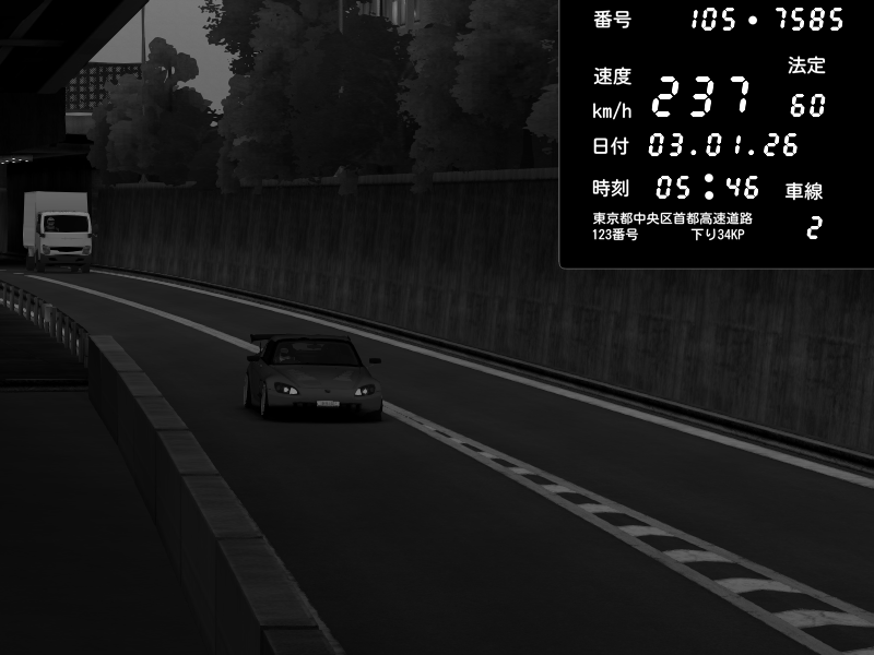 | 2026/01/03 05:46 | C1外回り 京橋 | 237 / 60 km/h | SXUNDWAVE | Honda S2000 (AP2 - Legendary) | CAPTURE |