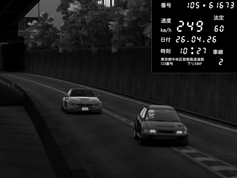 | 2026/04/26 10:27 | C1外回り 京橋 | 254 / 60 km/h | AK_1👹 | Mitsubishi Lancer Evolution V Wangan Spec | CAPTURE |