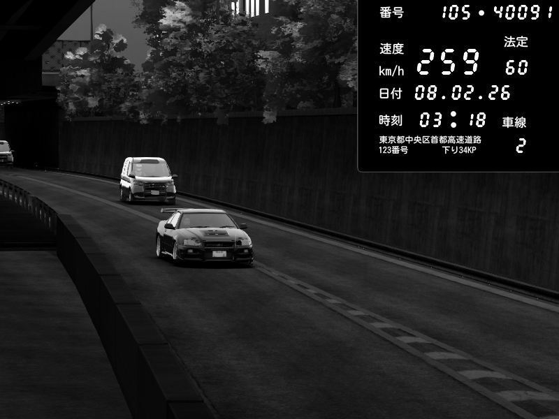 | 2026/02/07 18:21 | C1外回り 京橋 | 237 / 60 km/h | Kurokabe | Nissan Skyline GT-R R34 Nismo Omori Factory S1 | CAPTURE |