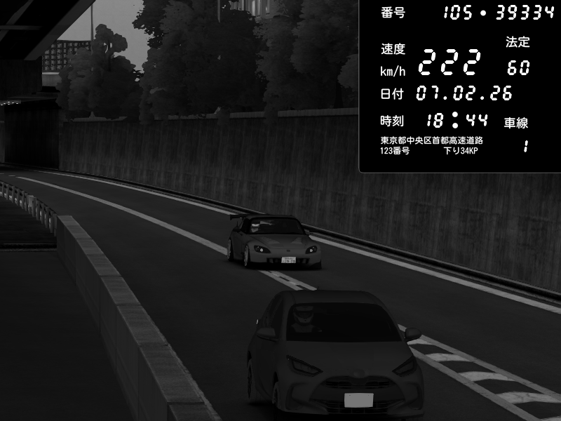 | 2026/02/07 18:44 | C1外回り 京橋 | 222 / 60 km/h | yukisaki_trkr | Honda S2000 (AP2 - Legendary) | CAPTURE |