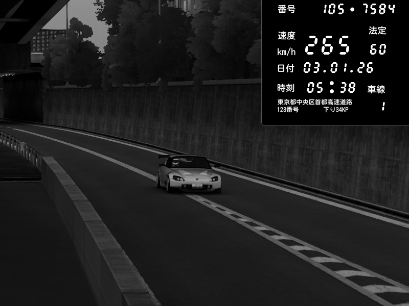 | 2026/01/03 05:38 | C1外回り 京橋 | 265 / 60 km/h | Desturno | Honda S2000 (AP2 - Legendary) | CAPTURE |
