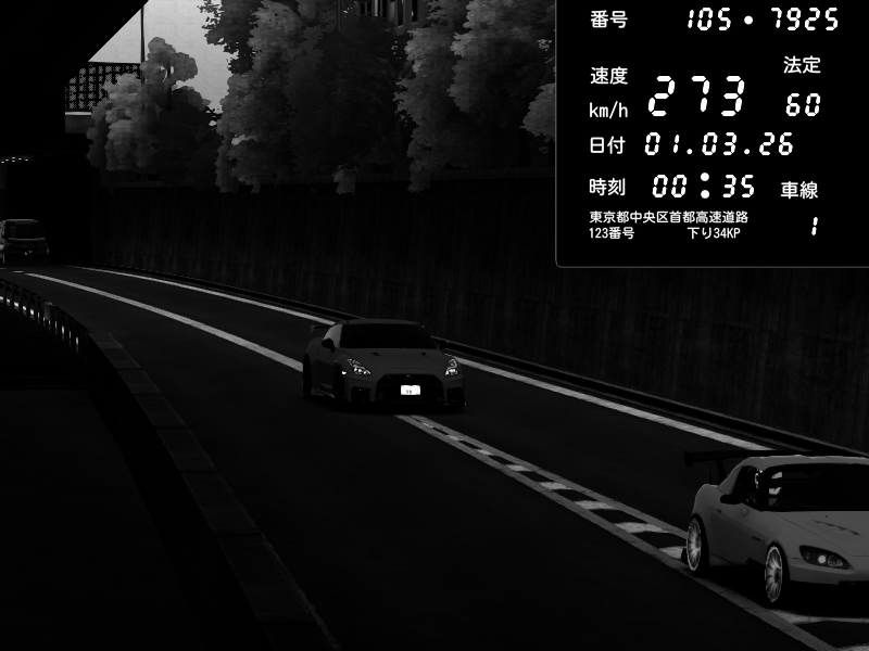 | 2026/03/01 00:35 | C1外回り 京橋 | 273 / 60 km/h | Kotone | Nissan GT-R NISMO 2017 | CAPTURE |