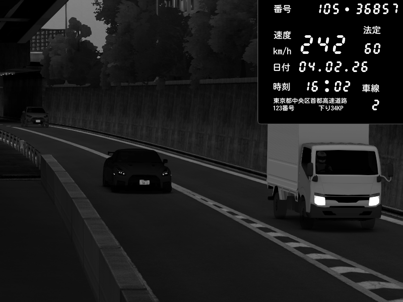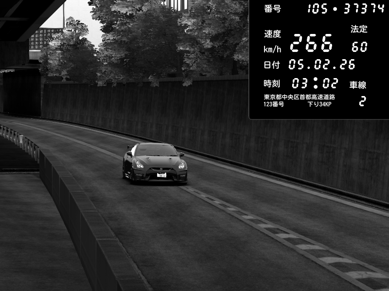 | 2026/02/05 03:02 | C1外回り 京橋 | 266 / 60 km/h | snow_mogul | Nissan GT-R NISMO 2017 | CAPTURE |