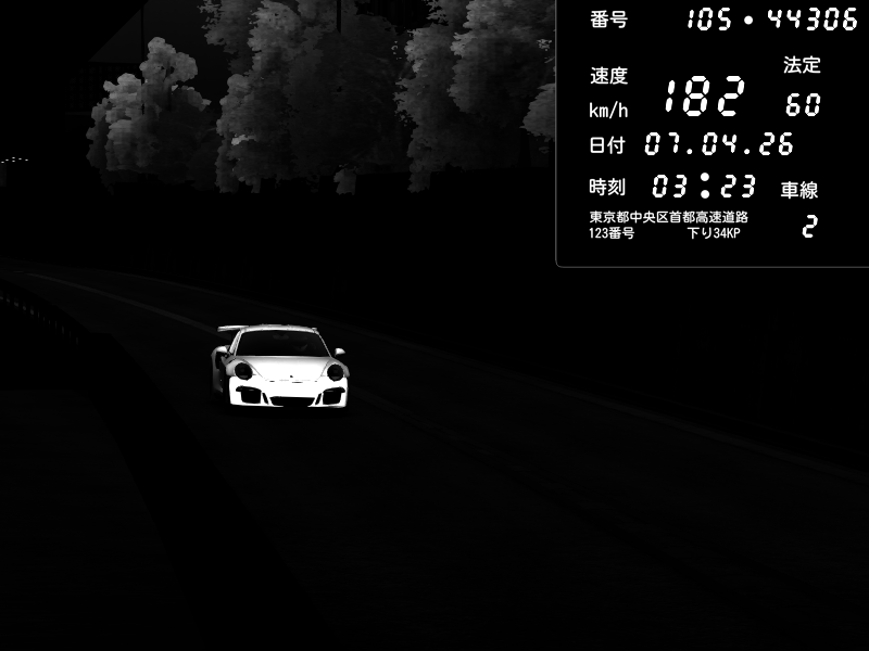 | 2026/04/07 03:23 | C1外回り 京橋 | 182 / 60 km/h | MASUO-JP | Porsche 911 GT3 RS | CAPTURE |
