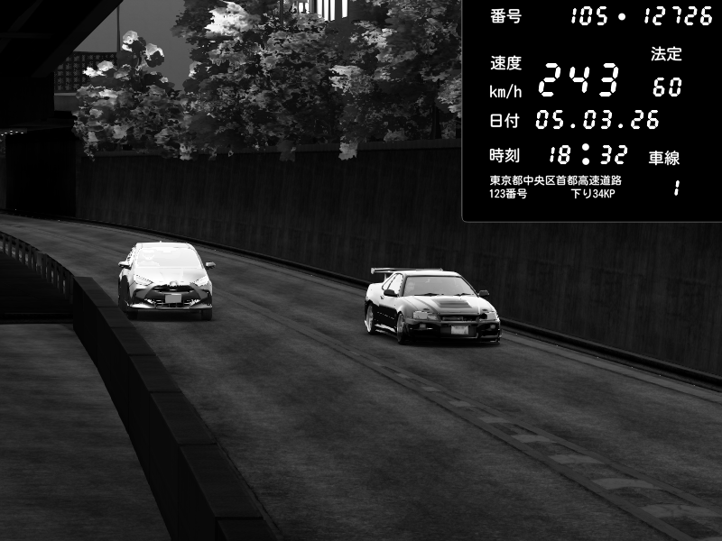 | 2026/03/06 00:37 | C1外回り 京橋 | 276 / 60 km/h | Chiyo | Nissan Skyline GT-R R34 Nismo Omori Factory S1 | CAPTURE |