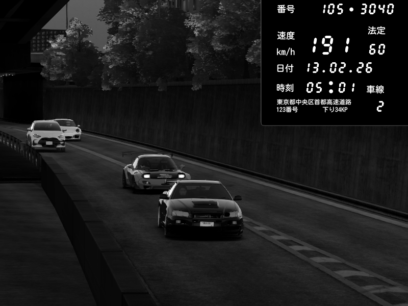 | 2026/02/14 02:31 | C1外回り 京橋 | 280 / 60 km/h | WatashiWatagashi | Mazda RX-7 FD3S FEED Afflux GT3 | CAPTURE |