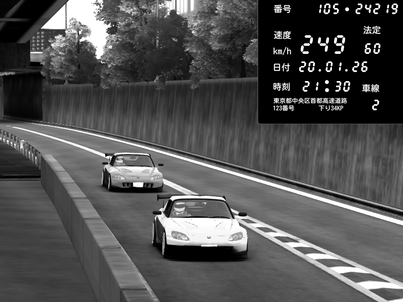 | 2026/01/20 21:30 | C1外回り 京橋 | 249 / 60 km/h | yuuki | Honda S2000 (AP2 - Legendary) | CAPTURE |