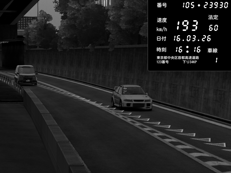 | 2026/03/16 16:16 | C1外回り 京橋 | 193 / 60 km/h | Chiyo | Mitsubishi Lancer Evolution V Wangan Spec | CAPTURE |