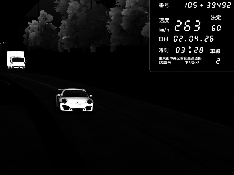 | 2026/04/02 02:55 | C1外回り 京橋 | 263 / 60 km/h | MASUO-JP | Porsche 911 GT3 RS | CAPTURE |