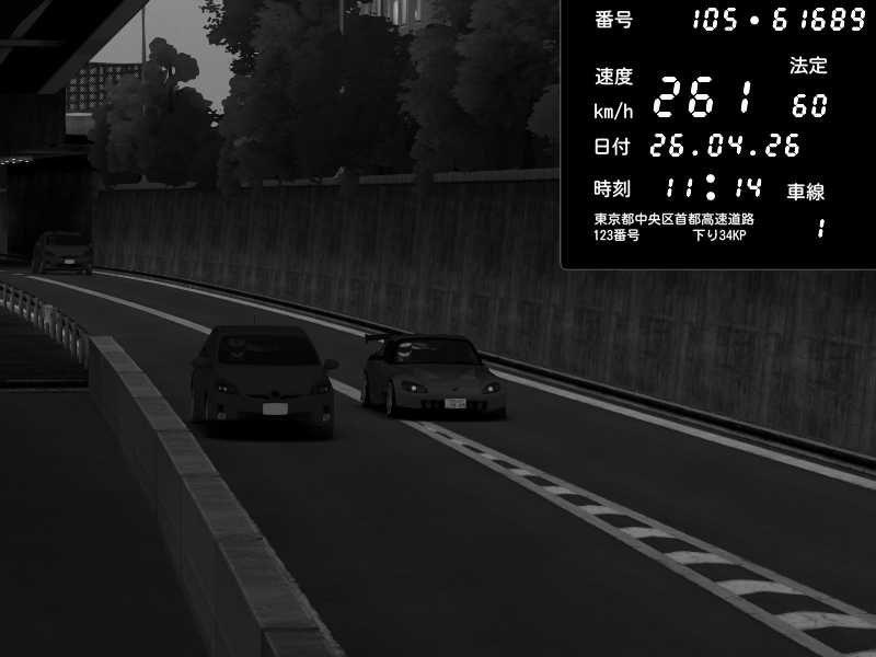 | 2026/04/26 11:14 | C1外回り 京橋 | 261 / 60 km/h | クロちゃん | Honda S2000 (AP2 - Legendary) | CAPTURE |