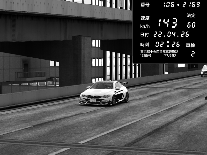 | 2026/04/20 23:23 | 9号下り 木場 | 199 / 60 km/h | Lily | BMW M4 crash.Sp Varis Widebody | CAPTURE |