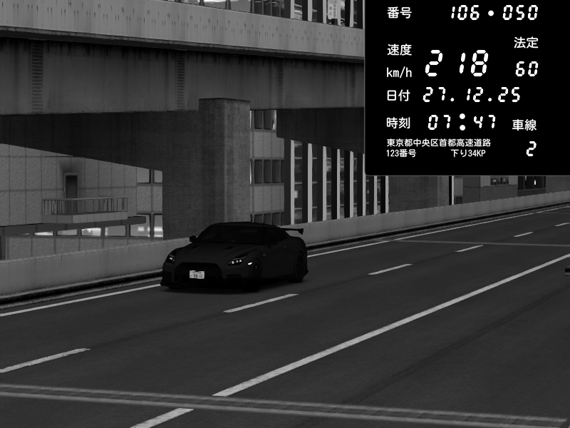| 2025/12/26 22:34 | 9号下り 木場 | 206 / 60 km/h | shibainu | Nissan GT-R NISMO 2017 | CAPTURE |
