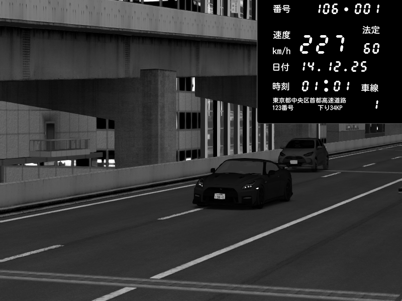 | 2025/12/12 23:32 | 9号下り 木場 | 199 / 60 km/h | SS39 | Nissan GT-R NISMO 2017 | CAPTURE |