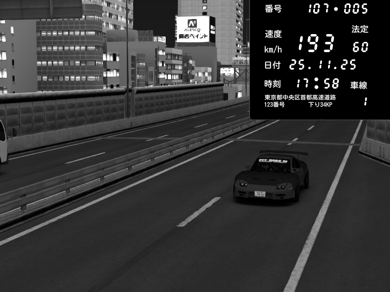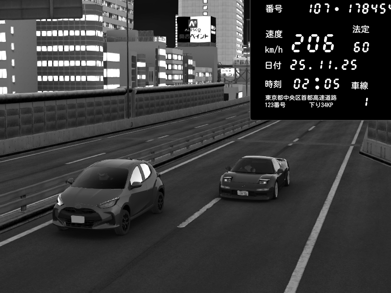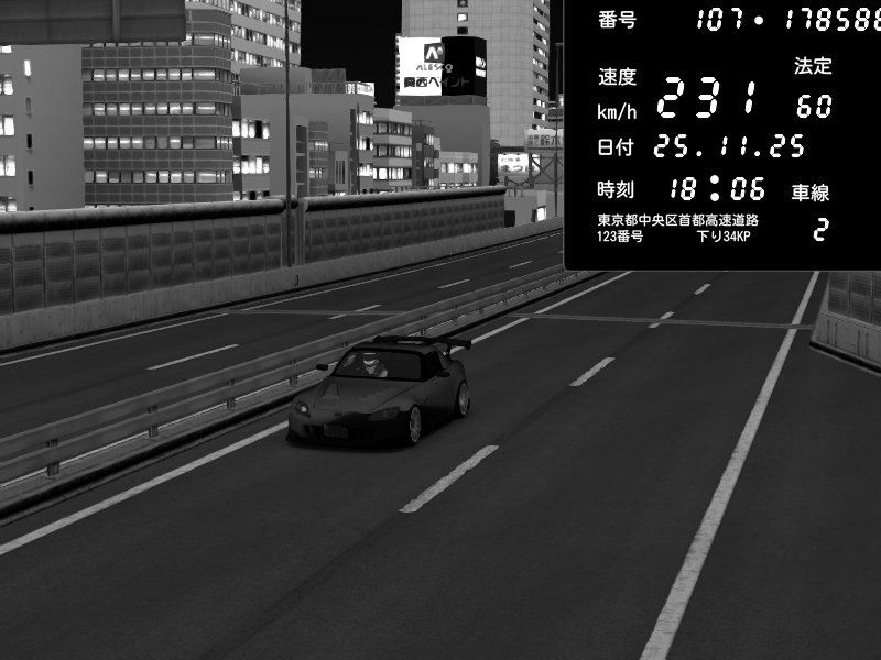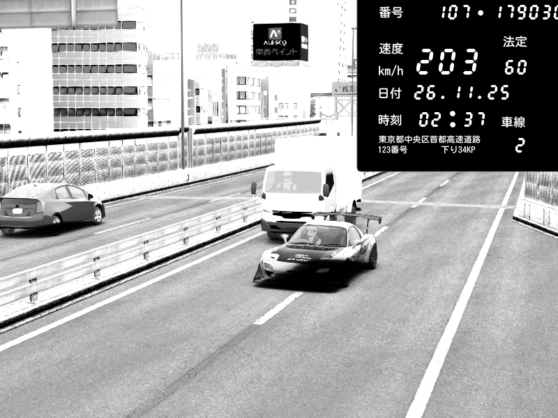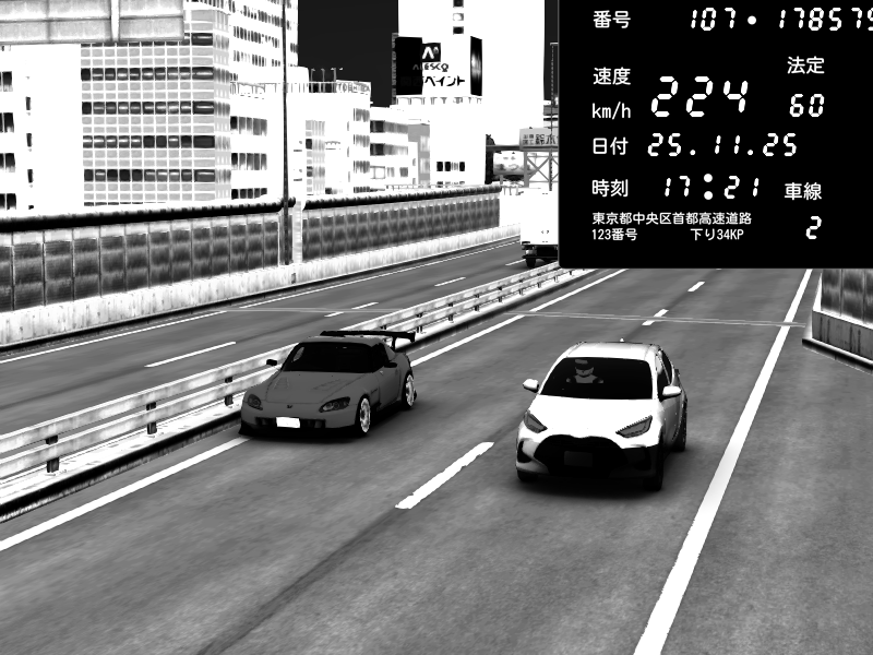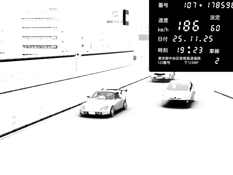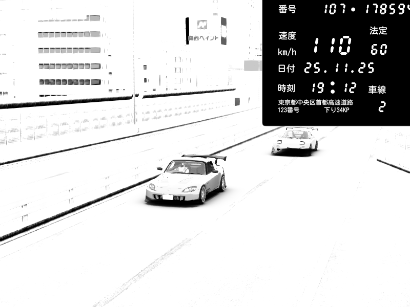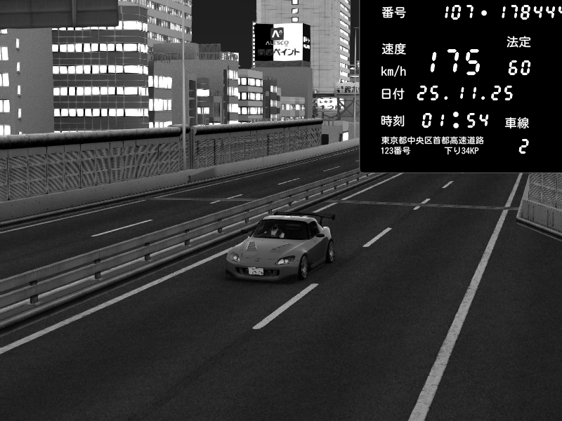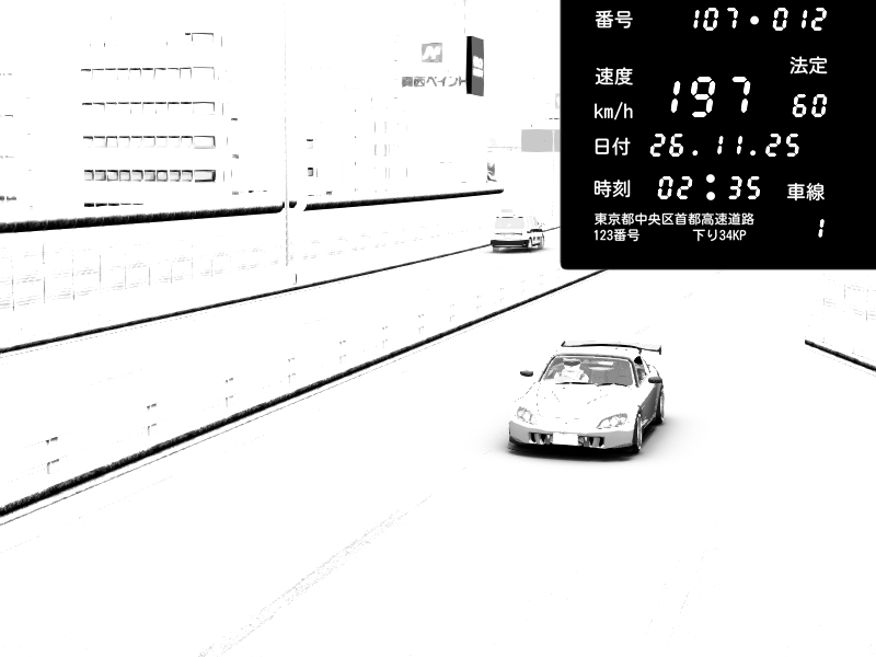 | 2025/11/26 02:18 | C1外回り 芝公園 | 182 / 60 km/h | Player | Honda S2000 Turbo GT1 Amuse (AP1) | CAPTURE |