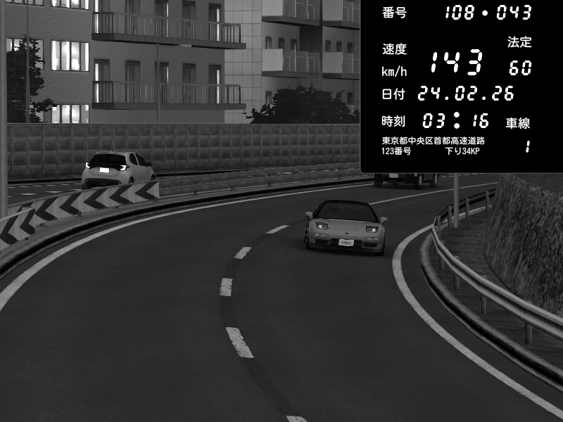 | 2026/02/23 15:30 | 4号下り 代々木 | 102 / 60 km/h | GORO DAIMON GAMES | Nissan Skyline GTR R33 (S3 - Wangan) | CAPTURE |